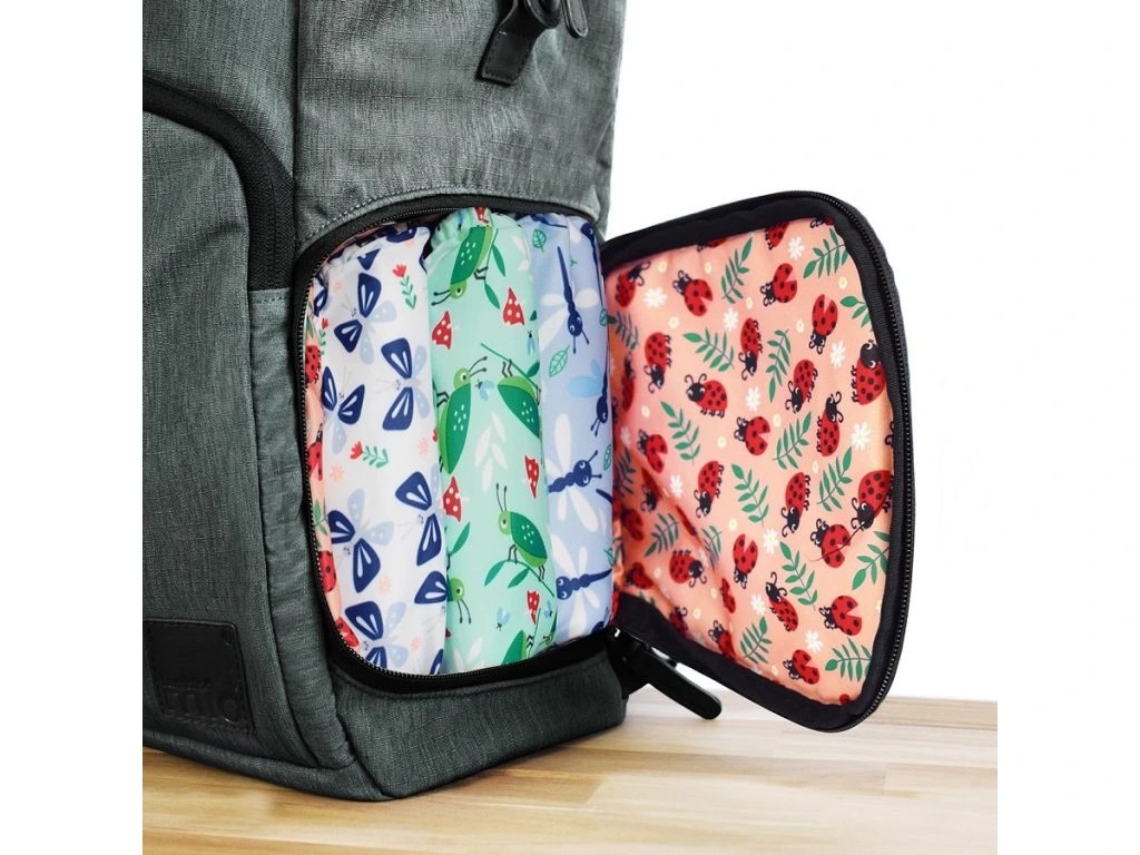 - Kompatibilní s látkovými plenkami – mnoho prostoru pro uložení opakovaně použitelných plen a unikátní voděodolná kapsa* pro uložení použitých plenek.